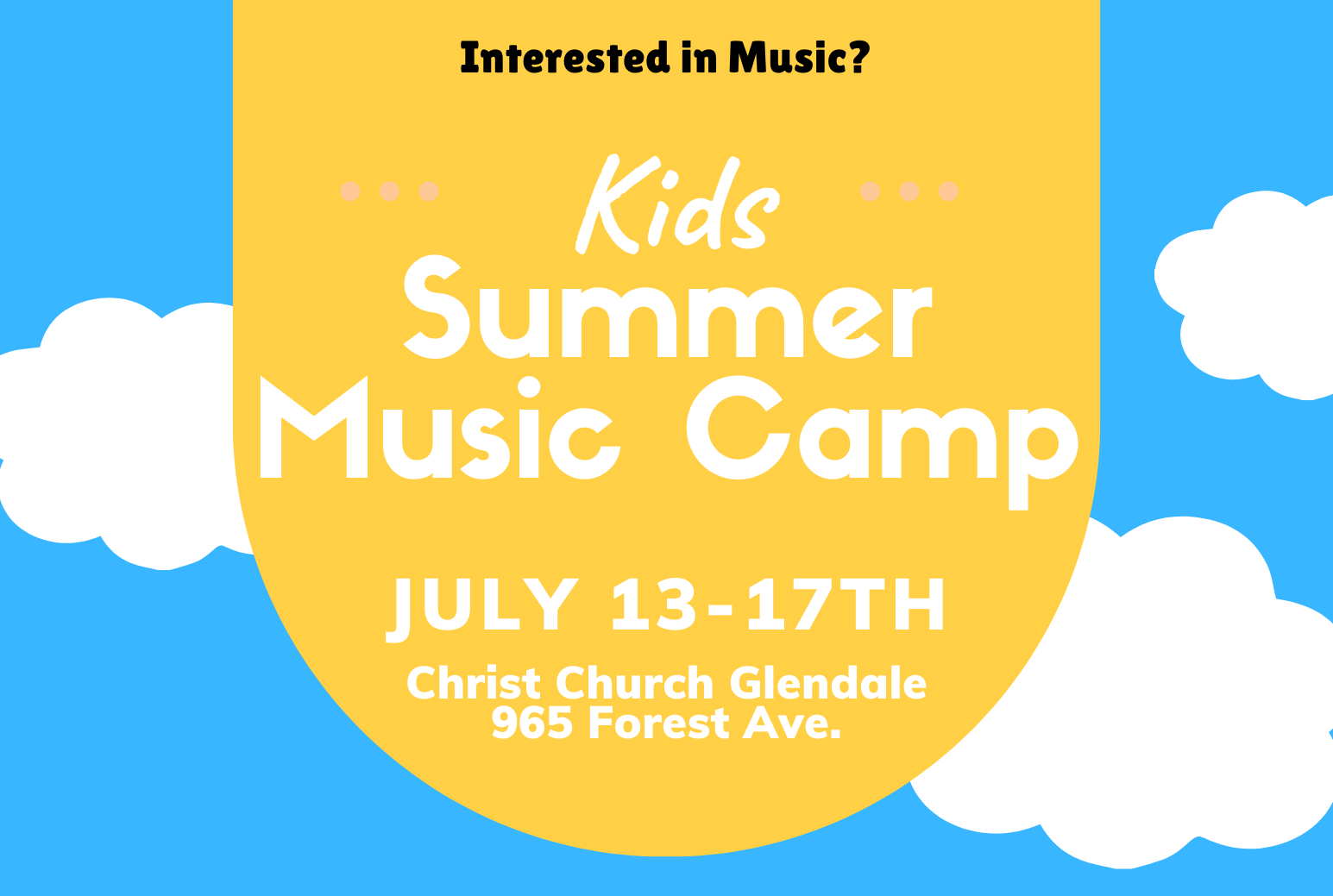 The music we sing will be sacred and include fun “camp style” songs as well as more serious music by well-known composers like Mozart. We will also feature a short daily worship service led by our participants, and a Bible teaching moment, led by a member of our clergy. We will also talk about how music functions in a church service and work toward singing during our 11 am church service on the Sunday after camp concludes.